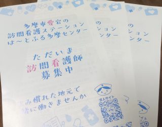 まずひとつは、地域の方々に『訪問看護』の存在そのもの、そして『は~とふる多摩センター』の固有名詞を知っていただくこと。訪問看護は、まだまだ認知が十分とは言えず、「どんなサービス?」「誰が使えるの?」という声を耳にすることがあります。求人チラシですから、看護師資格をお持ちの方に届かなければ意味がないといえばそれまでなのですが、受け取りてがどなたであってもチラシを目にしていただいて「近所に地域を看る看護師さんがいるんだ」と知っていただける方がいらっしゃれば、それだけで一歩前進という解釈です。